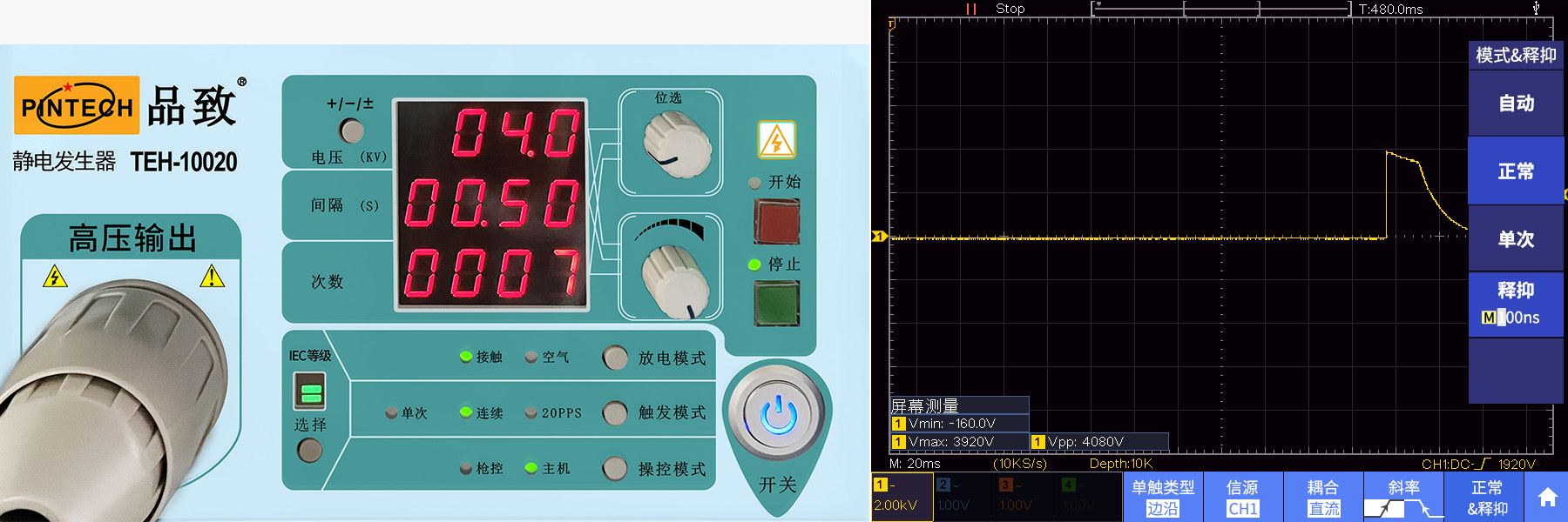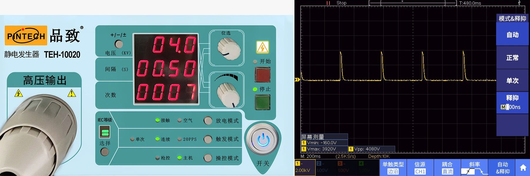 如上圖所示,靜電發(fā)生器設(shè)置為連續(xù)多次輸出,示波器在“Menu”觸發(fā)菜單里選擇正常觸發(fā)方式。設(shè)置時間參數(shù)為20ms,觸發(fā)電壓為500V。當(dāng)靜電發(fā)生器的第一個觸發(fā)信號到來時,示波器屏幕會顯示掃描到的信號波形,并停留,直到掃描到下個信號,如此直到接收最后一個信號為止。