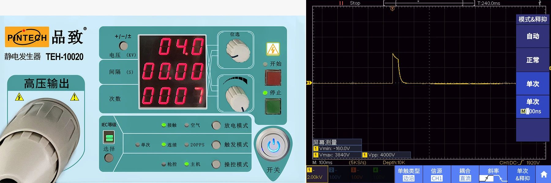如上圖所示,靜電發(fā)生器設(shè)置為單次輸出,示波器在“Menu”觸發(fā)菜單里選擇單次掃描方式,也可在示波器右上角按單次“Single”按鈕。當(dāng)靜電發(fā)生器輸出單次脈沖信號后,示波器能快速捕捉到該波形,并鎖存,此時右上角的運(yùn)行/停止“Run/Stop”按鈕點亮。當(dāng)要再次捕捉該信號時,需先按“Run/Stop”按鈕,解除鎖定。