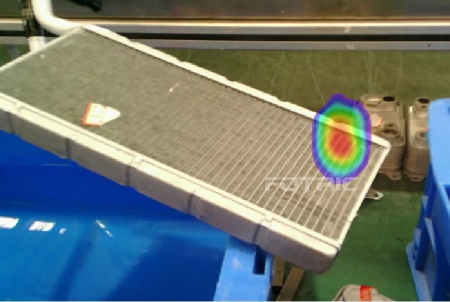 在打入氣體后,采用FOTRIC聲像儀檢測(cè)冷凝器,只需對(duì)著冷凝器便可捕捉泄漏處發(fā)出的超聲波聲音,操作簡(jiǎn)單,測(cè)試速度快,也可以直觀定位泄漏點(diǎn)的位置。