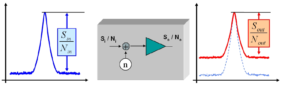 如何描述噪聲系數(shù)的大小呢?噪聲系數(shù)的一般定義為:待測件輸入信噪比與輸出信噪比的比值,F(xiàn)=(Sin/Nin)/(Sout/Nout)。假定輸入信號由兩部分組成,輸入有用信號Sin和輸入噪聲Nin,因此待測件輸入端的信噪比為Sin/Nin。如果待測件的增益為G,Sout=SinG,輸出信噪比Sout/Nout=SinG/Nout,因此有F=Nout/NinG,所以噪聲系數(shù)也可以定義為待測件輸出噪聲功率與輸入噪聲功率和待測件增益乘積的比值。