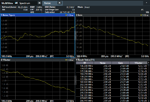 冷源法測試噪聲系數(shù)需要使用矢量網(wǎng)絡(luò)分析儀,通過校準(zhǔn)來表征矢網(wǎng)的測量接收機(jī)的噪聲系數(shù),可以使用一個功率計(jì)做掃頻測量來獲得接收機(jī)的有效噪聲帶寬。在這里需要主意的是,冷源法測量中所使用的功率計(jì)只是在校準(zhǔn)時才用到,校準(zhǔn)之后再對被測器件進(jìn)行測試時就不再需要了。使用等于系統(tǒng)阻抗的電阻負(fù)載連接被測件的輸入,測量被測件的輸出噪聲功率,再使用兩端口S參數(shù)測量被測件的增益,并利用這兩個結(jié)果計(jì)算得到噪聲系數(shù)。由于矢量網(wǎng)絡(luò)分析儀單獨(dú)就能完成增益的測量,冷源法通常與矢量網(wǎng)絡(luò)分析儀一起使用。矢量網(wǎng)絡(luò)分析儀可同時實(shí)現(xiàn)噪聲系數(shù)測量、S 參數(shù)測量、壓縮測量、交調(diào)測量與變頻測量,提高了測量效率,同時也減小了反復(fù)連接帶來的不確定性。下圖為矢量網(wǎng)絡(luò)分析儀ZNA的噪聲系數(shù)測試結(jié)果。