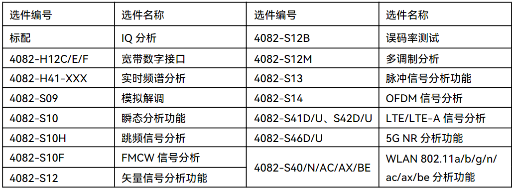 分析帶寬的選擇與分析功能密不可分。首先需要明確在實(shí)際測試中想要做哪些類型信號(hào)的分析,這些信號(hào)自身帶寬是多少,然后才能選擇合適的分析帶寬來進(jìn)行信號(hào)分析。4082軟件功能選件中與分析帶寬相關(guān)的功能如表1所示。