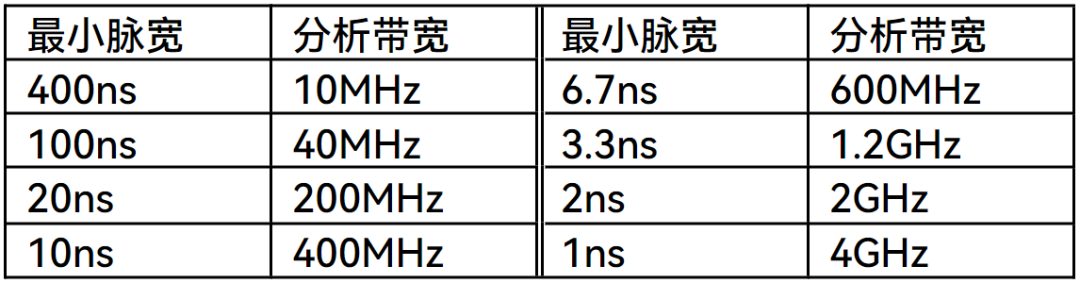 表2脈沖信號(hào)脈寬與所需分析帶寬對(duì)應(yīng)表