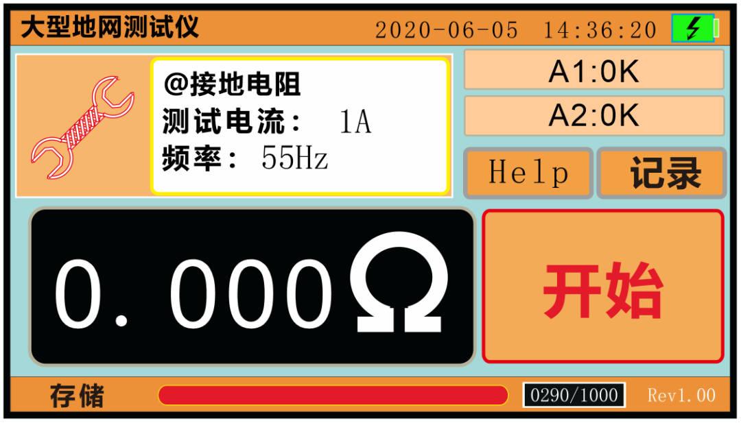 按“左”或“右”鍵來(lái)選擇功能:依次為“接地電阻”, “電流樁”,“電壓樁”,“接地導(dǎo)通”,“ 土壤電阻率”,“跨步電壓、接觸電壓、電位梯度”
