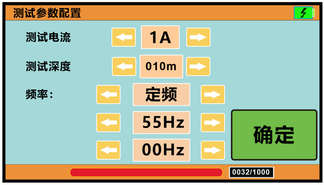 按“左”或“右”鍵來(lái)選擇測(cè)試電流大?。阂来螢?A / 2A / 3A / 4A / 5A。選擇土壤電阻率測(cè)試間隔:0-100米。選擇測(cè)試頻率為定頻或變頻,頻率范圍為40-60Hz