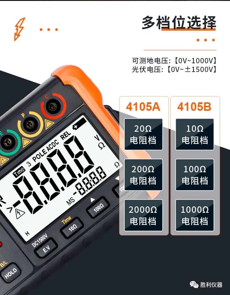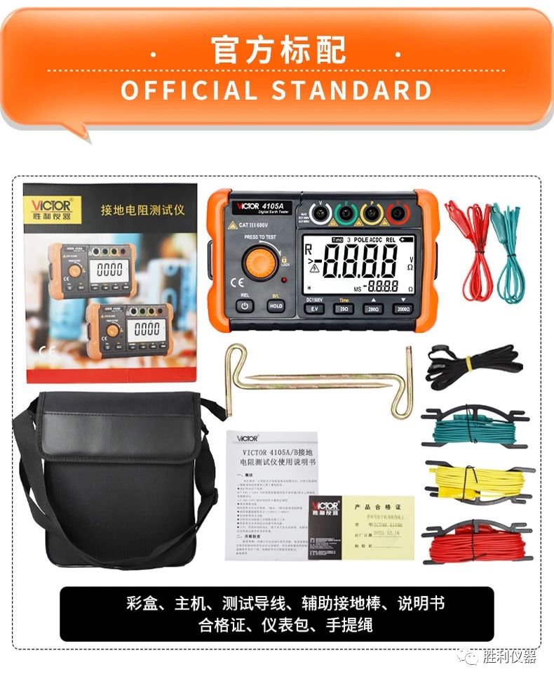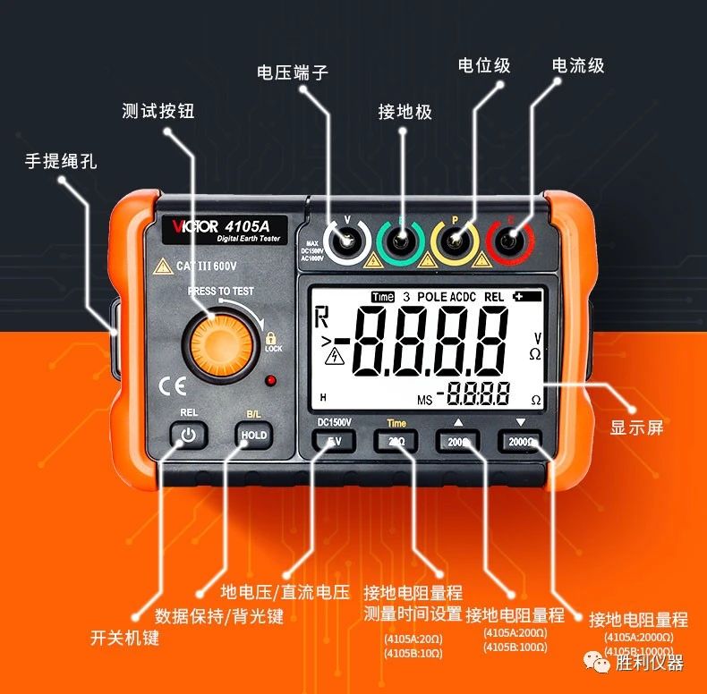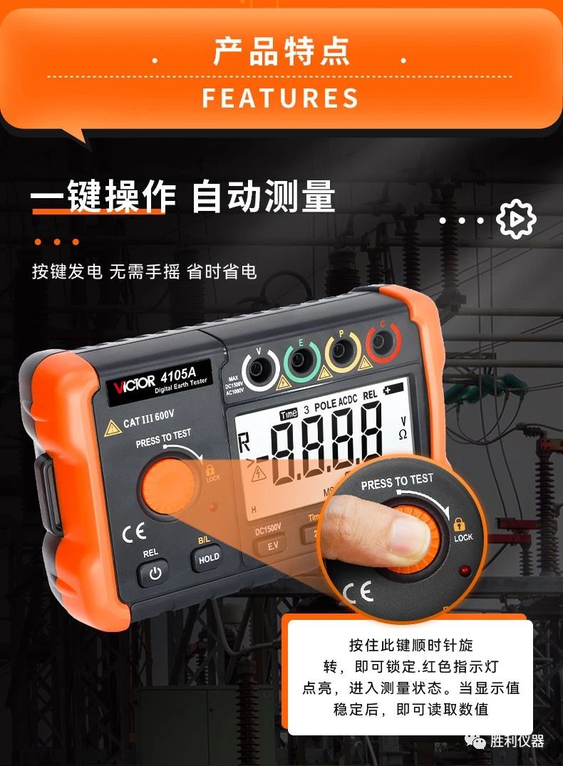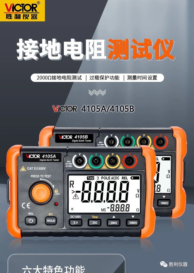 勝利儀器產(chǎn)品推薦:接地電阻測試儀VCTOR 4105A/4105B,具備20000Ω接地電阻測試、過載保護功能、測量時間設(shè)置等特點。以下是詳細介紹: