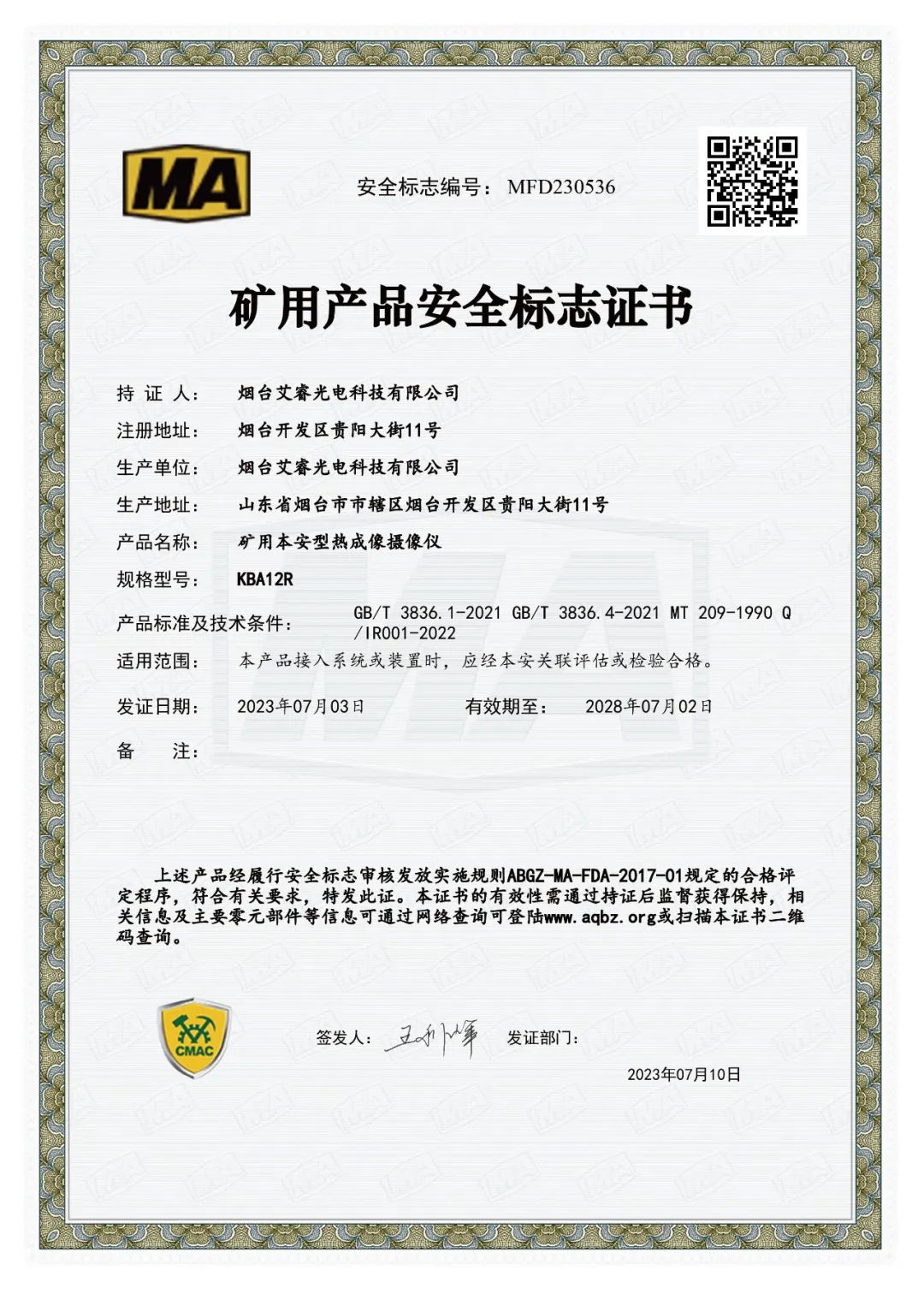 煤安認(rèn)證:Ex ibⅠMb(產(chǎn)品防爆標(biāo)志),確保在危險(xiǎn)環(huán)境下的安全可靠性;