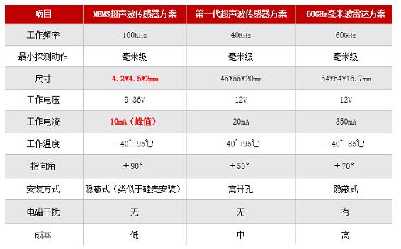 方案搭載的MEMS超聲波傳感器采用MEMS微納工藝與封裝制造方法,尺寸為4.2*4.5*2mm,遠(yuǎn)小于開(kāi)放式超聲波傳感器方案和毫米波雷達(dá)方案。