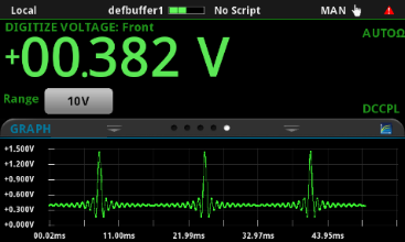 DMM6500可以更加直觀地看到測試結果,它不僅在顯示屏上提供讀數(shù),還可以繪制用數(shù)字化器捕獲的波形。通過觸摸屏,工程師可以使用DMM6500的手指開合縮放功能擴展波形的各個部分,即時獲得對測量的洞察。另外,還可使用光標和計算機統(tǒng)計信息來檢定波形。