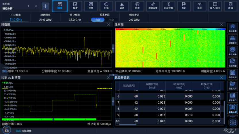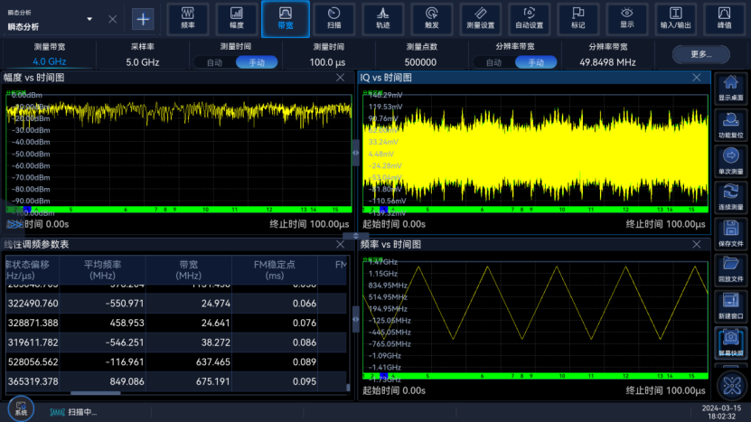 車載毫米波雷達(dá)常用的工作頻段主要包括24GHz、60GHz、77GHz。24GHz頻段主要用于短距離應(yīng)用,77GHz頻段的毫米波雷達(dá)適用于更遠(yuǎn)距離和更復(fù)雜的應(yīng)用。車載毫米波雷達(dá)通常采用調(diào)頻連續(xù)波(FMCW)雷達(dá),其工作頻率隨時(shí)間做周期性線性變化,能測速和測距,適合做近距離測量,有較高的測量精度。4082系列4GHz分析帶寬選件配合FMCW信號分析功能選件,能夠?qū)MCW信號頻率偏差、線性調(diào)頻斜率、狀態(tài)偏差、相位偏差、功率等關(guān)鍵參數(shù)進(jìn)行自動分析,同時(shí)通過瀑布圖、參數(shù)列表、趨勢圖、直方圖等豐富的圖表進(jìn)行測試結(jié)果與數(shù)據(jù)顯示。