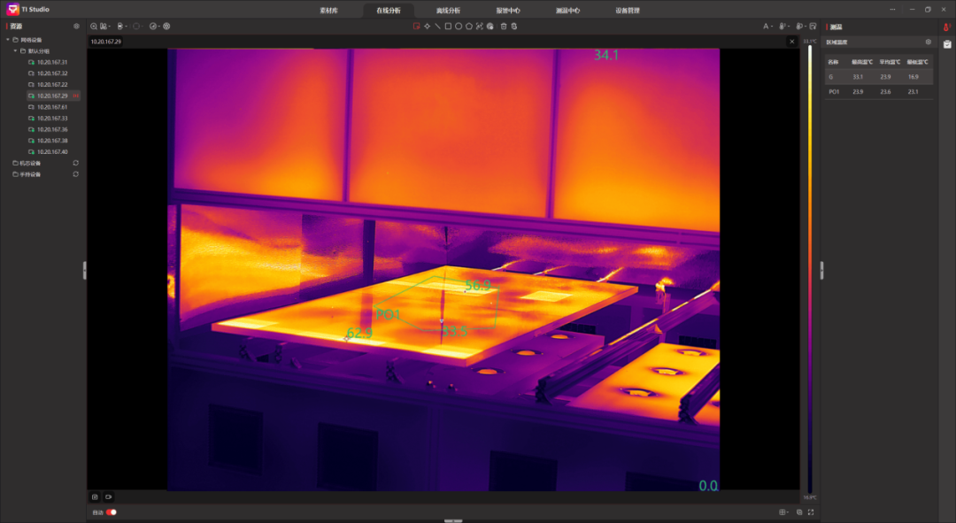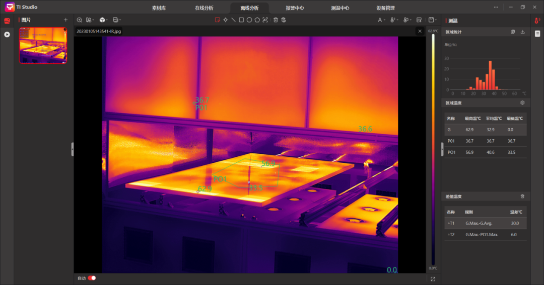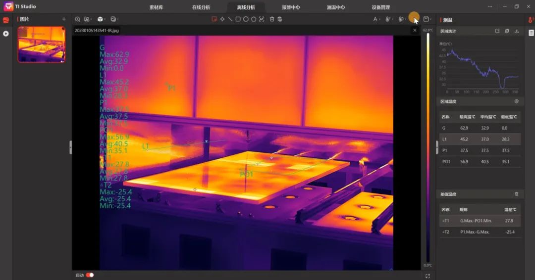 除點(diǎn)、線、面測溫外,TI Studio還提供差值測量、區(qū)域溫度統(tǒng)計(jì)、溫度梯度分析等更高級的測量模式,幫助用戶更深入地了解被測物體的溫度分布情況。