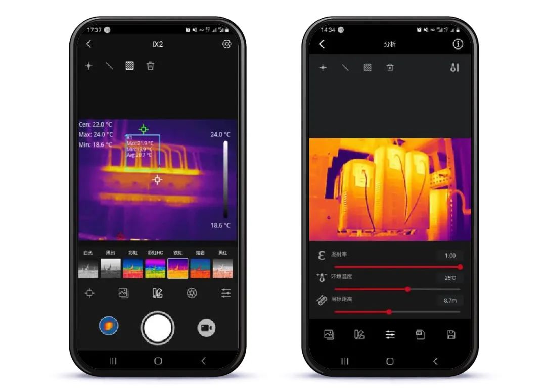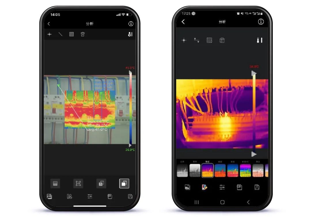 手機(jī)APP支持點(diǎn)、線、框測溫對象,滿足多種溫度追蹤、分析需求 。可實(shí)時展示測溫對象最低溫、最高溫和平均溫,測溫結(jié)果一目了然,支持圖片二次分析,溫度異常不遺漏。
