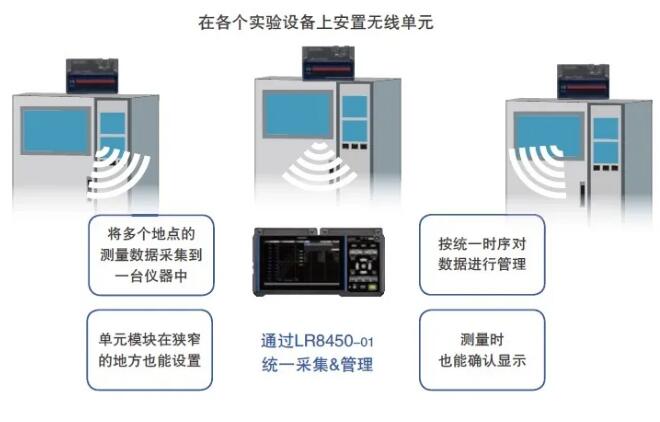LR8450-01還能在此基礎(chǔ)上再通過(guò)無(wú)線連接7個(gè)無(wú)線單元,也就是4個(gè)電壓/溫度單位U8552(30個(gè)通道)加上7臺(tái)無(wú)線電壓/溫度單元LR8532(30個(gè)通道)。這樣可以使用1臺(tái)LR8450-01總共測(cè)量330個(gè)通道的電壓和溫度。