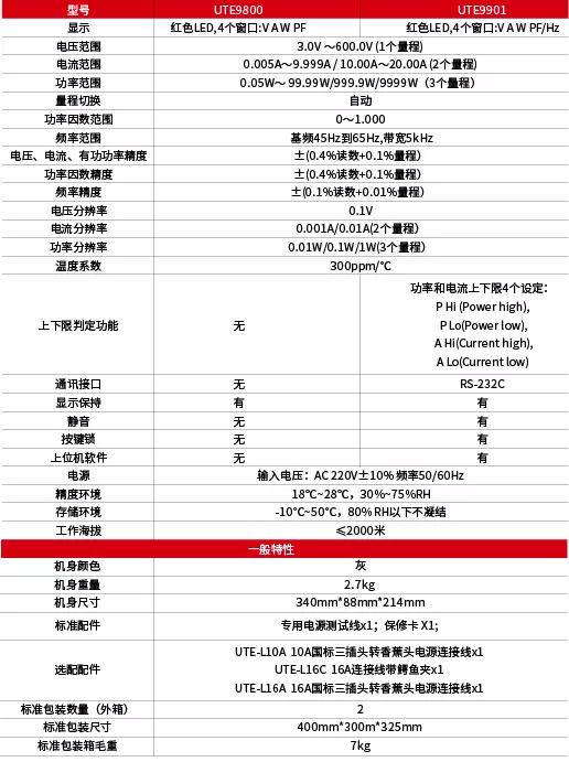 ● UTE9800 四參數(shù)測量:V A W PF ;UTE9901五參數(shù)測量:V A W PF/Hz