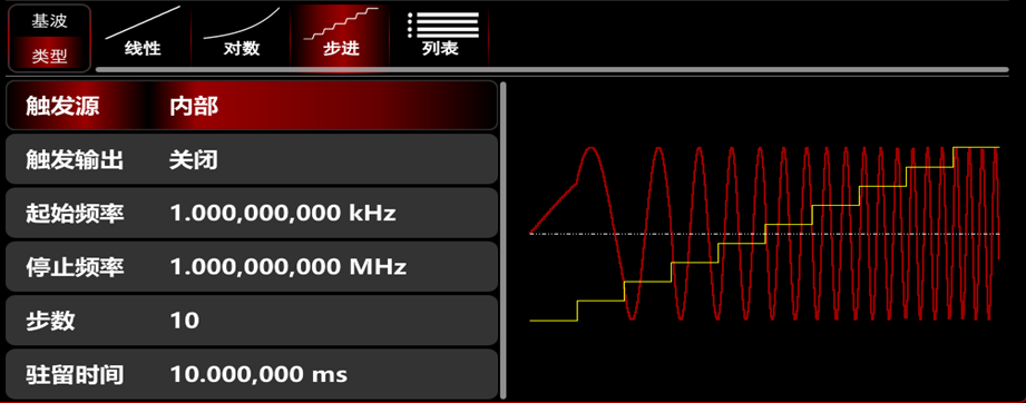 ● 設(shè)置好每個(gè)頻點(diǎn)之間的頻率步進(jìn)和時(shí)間間隔,按步進(jìn)進(jìn)行掃頻。