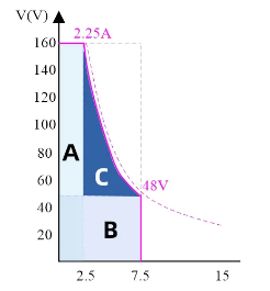 區(qū)別于傳統(tǒng)電源的矩形輸出范圍,SPS5000X在限定輸出功率條件下,電壓電流量程自動(dòng)切換,在一臺(tái)電源上實(shí)現(xiàn)多種電壓和電流的組合輸出。因而提供了更寬的電壓電流輸出范圍,極大的提高了電源的利用率。如下圖所示,兩臺(tái)傳統(tǒng)電源的輸出范圍分別是淺灰色A,B區(qū)域,而一臺(tái)SPS5000X電源即可覆蓋A,B,C輸出區(qū)域。