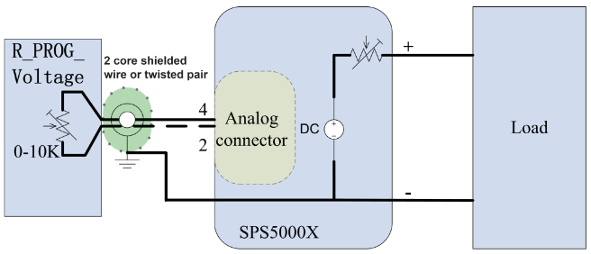 外部模擬控制有四種工作模式:電壓控制電壓,電壓控制電流,電阻控制電壓,電阻控制電流。此種傳統(tǒng)控制方式簡(jiǎn)單快捷,比如外接一個(gè)0-10kΩ電位器,即可通過(guò)調(diào)節(jié)電阻的阻值控制電源的輸出值。