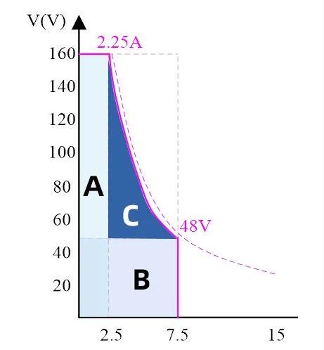 此外,區(qū)別于傳統(tǒng)電源的矩形輸出范圍,SPS5000X在限定輸出功率條件下,電壓電流量程自動(dòng)切換,在一臺(tái)電源上實(shí)現(xiàn)多種電壓和電流的組合輸出。因而提供了更寬的電壓電流輸出范圍,極大的提高了電源的利用率。如下圖所示,兩臺(tái)傳統(tǒng)電源的輸出范圍分別是淺灰色A,B區(qū)域,而一臺(tái)SPS5000X電源即可覆蓋A,B,C輸出區(qū)域。
