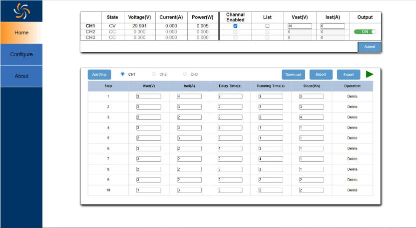 SPS5000X系列可支持最多三個(gè)通道,高達(dá)50步時(shí)序輸出。用戶(hù)可在機(jī)器前面板進(jìn)行時(shí)序輸出參數(shù)設(shè)置,也可通過(guò)遠(yuǎn)程網(wǎng)頁(yè)控制功能,進(jìn)行更快捷方便的設(shè)置。
