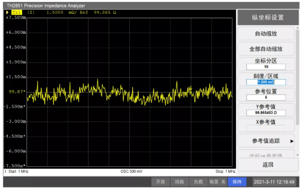 下圖是在速度 5、測(cè)試頻率 1MHz,測(cè)量 100Ω電阻的曲線,由下圖可見(jiàn)其軌跡噪聲≦0.003%(≦±0.0015Ω)。