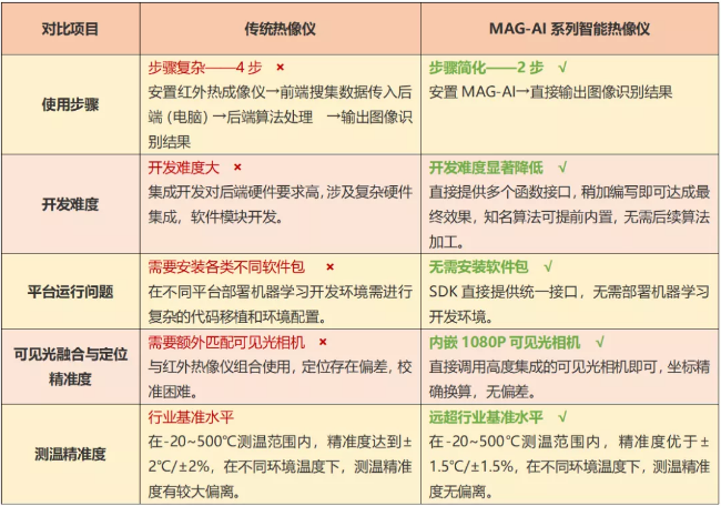 為了能更直觀地理解以上三項(xiàng)重大技術(shù)創(chuàng)新所帶來的產(chǎn)品升級(jí),我們將巨哥MAG-AI系列智能熱像儀與傳統(tǒng)熱像儀進(jìn)行了一個(gè)對(duì)比: