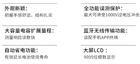 大電容測量功能使對電容測量有所要求的用戶可以消耗更少的成本來獲得更高的工作效率,不再需要在使用萬用表的同時(shí)還要增添一臺(tái)電容表。