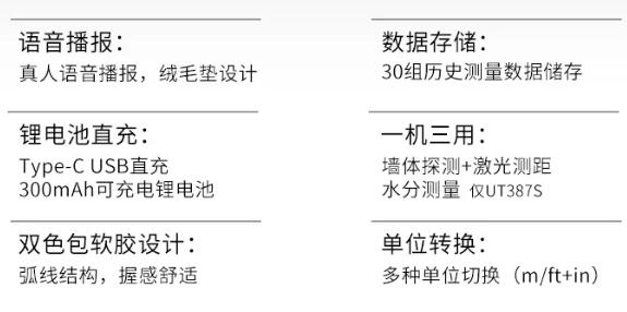 一機(jī)多用隨時(shí)轉(zhuǎn)換,墻體探測+激光測距+木材水分測量(僅UT387S)