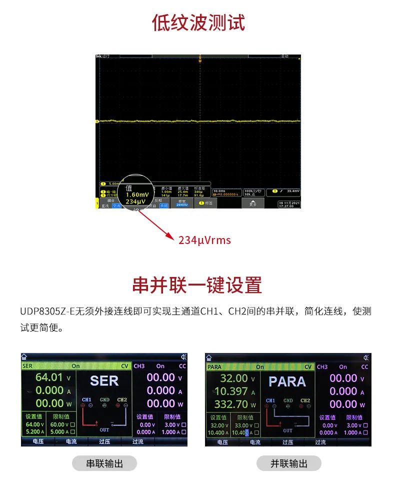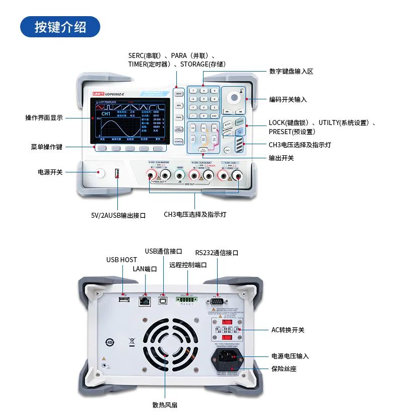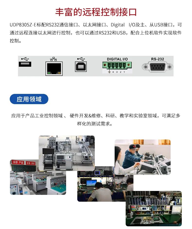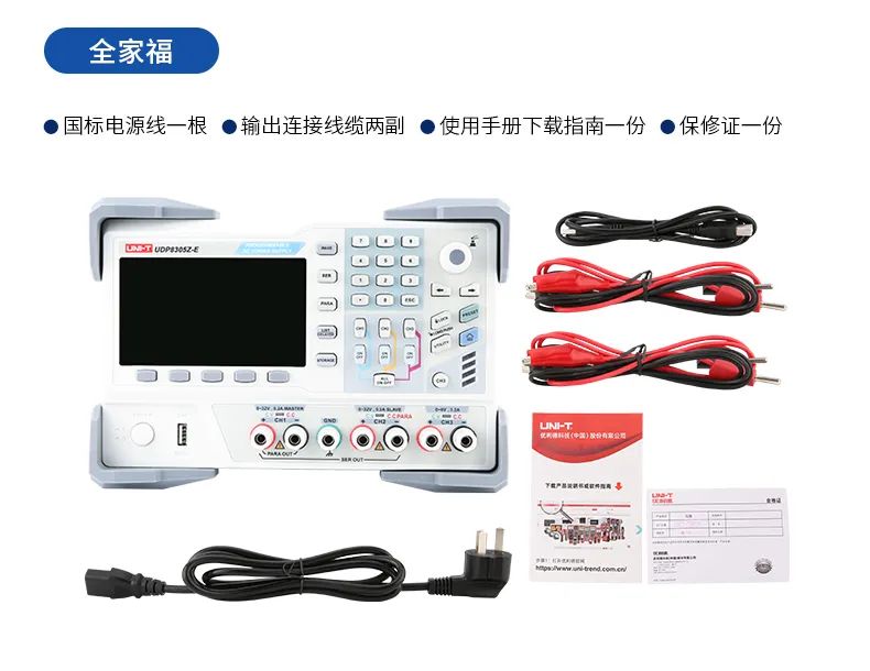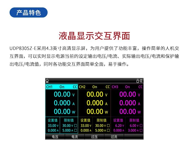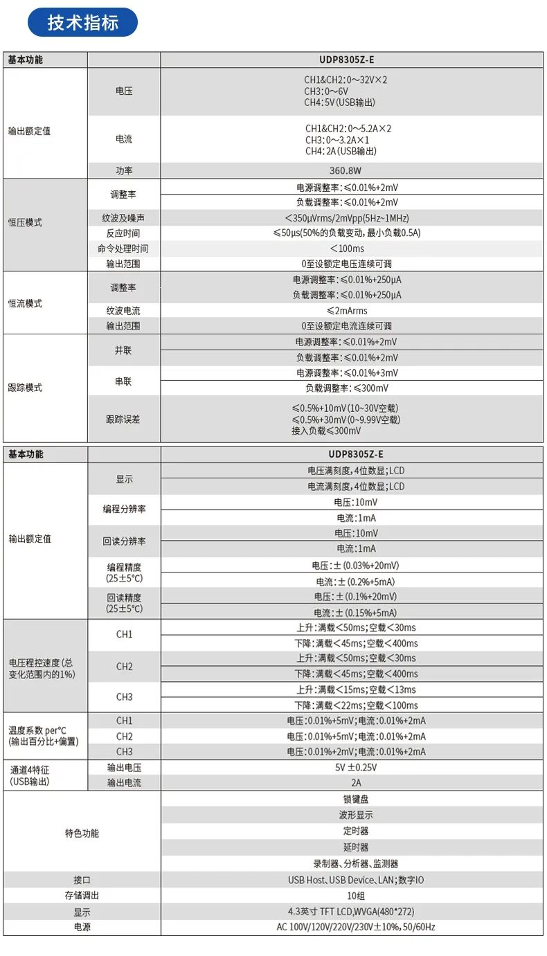 UDP8305Z-E可編程線性直流穩(wěn)壓電源具有兩路32V/5.2A輸出、一路6V/3.2A和一路標(biāo)準(zhǔn)USB輸出,產(chǎn)品4.3英寸TFT大屏提供豐富的功能界面,使列表/延時(shí)器功能、觸發(fā)器、監(jiān)測(cè)器功能、波形顯示功能、系統(tǒng)設(shè)置和輸出預(yù)設(shè)功能等便捷易用。產(chǎn)品全系列標(biāo)配標(biāo)準(zhǔn)RS232通信接口,支持SCPI協(xié)議,以太網(wǎng)及Digital I/O等多個(gè)接口,方便遠(yuǎn)程控制,極低的負(fù)載調(diào)整率和低紋波噪聲輸出,且各通道相互隔離,使用串并聯(lián)功能時(shí)只需一鍵切換,應(yīng)用范圍廣泛。