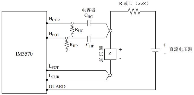 HIOKI日置C-V測試系統(tǒng)的回路結(jié)構(gòu)圖如下所示,利用LCR表的四端子測試方法,將電壓源負(fù)端與LCR的GUARD端子相連,并由偏置單元施加到被測物兩端。通過交流信號注入法來獲取不同偏置電壓下的阻抗、相位、電容值、損耗因子等相關(guān)電參數(shù),并通過PC軟件描繪出特性曲線。