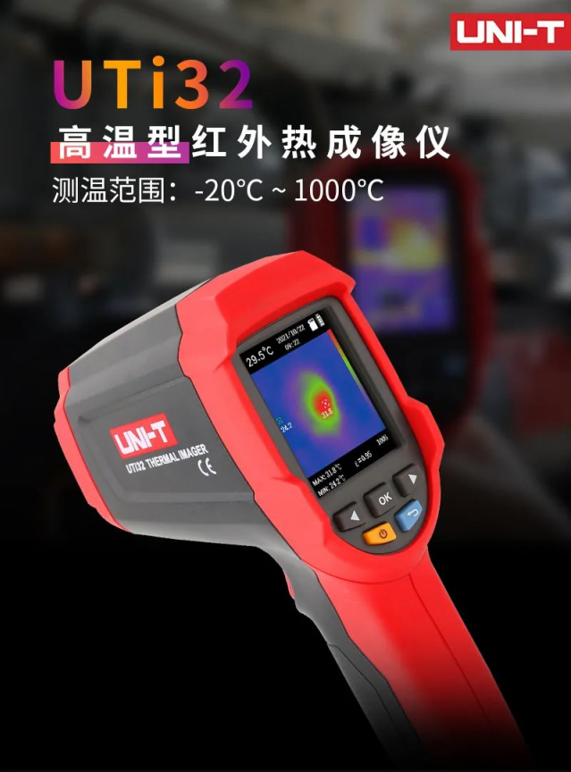 UTi32是一款測(cè)溫范圍為-20~1000℃的熱成像儀,滿足大多數(shù)測(cè)溫需求,配備可見光和紅外兩種鏡頭,可實(shí)現(xiàn)圖像融合模式來(lái)查看溫度數(shù)據(jù),并可保存實(shí)時(shí)圖像。具有中心點(diǎn)測(cè)溫和高低溫自動(dòng)追蹤功能,便于快速確認(rèn)溫度點(diǎn)。UTi32使用的是可充鋰電池,通過(guò)機(jī)身上Type-C接口充電,方便快捷!
