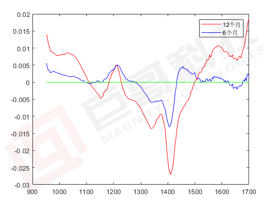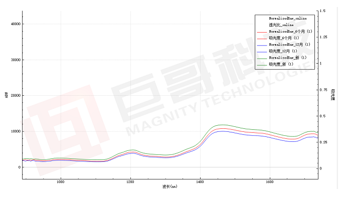 以新麥片為基準(圖中綠線),將光譜進行歸一化和相減,可以更清楚地看到存放時間引起的光譜變化,預示了成分和品質隨存放時間發(fā)生變化。