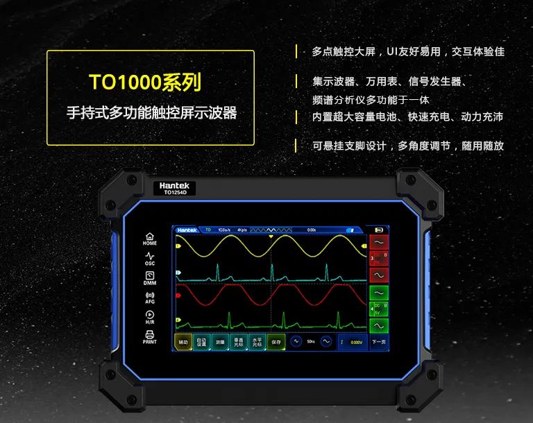 2022年9月9日,青島漢泰發(fā)布新一代TO1000系列多功能全觸屏示波器。TO1000系列多功能全觸屏示波器,機(jī)身薄、重量輕、易攜帶;獨(dú)特可懸掛設(shè)計(jì),解放雙手,防摔抗震、堅(jiān)固耐用;集示波器、萬用表、信號發(fā)生器、頻譜分析儀多功能于一體;內(nèi)置超大容量電池、續(xù)航持久、支持快速充電、動力充沛。