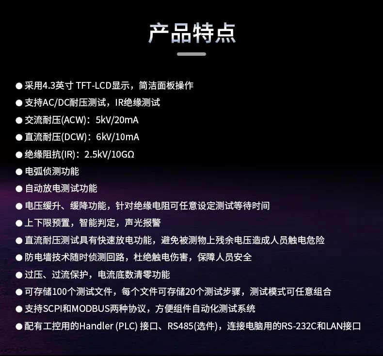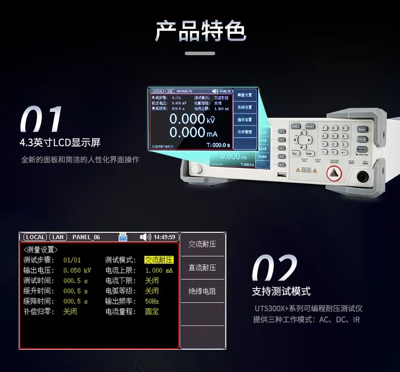 UT5300X+系列采用4.3英寸真彩液晶顯示,通過各種實(shí)體按鍵以及數(shù)字鍵盤可以快速完成各種測(cè)試條件設(shè)置。機(jī)身使用高性能32位ARM微處理器控制,能夠?qū)崟r(shí)測(cè)量被測(cè)體的各項(xiàng)安規(guī)參數(shù),整機(jī)線路模塊間采用全隔離措施,抗干擾能力強(qiáng),是集電氣強(qiáng)度(交/直流耐壓)、絕緣電阻多項(xiàng)測(cè)試功能于一體的儀器,可廣泛應(yīng)用于家用電器、變壓器、電氣設(shè)備、元器件的安全性能檢查,滿足生產(chǎn)線對(duì)快速測(cè)試的要求。