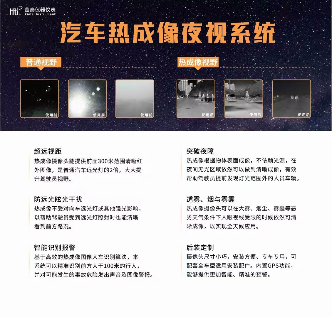 作為紅外熱成像領(lǐng)域的佼佼者,鑫泰儀器一直專注于紅外熱成像技術(shù)的探索和創(chuàng)新。智能汽車熱成像一體機(jī)采用10mm/3.6mm/1.5mm三種不同焦距的無熱化定焦鏡頭,分辨率為256*192/384*288/640*512,搭配1024*600分辨率的7寸高清顯示屏,不僅能無光成像,在漆黑的夜晚中智能識別100m以內(nèi)的移動(dòng)物體(如行人、動(dòng)物、自行車等),而且能屏蔽眩光,對前方的車輛燈光(汽車、電動(dòng)車等)進(jìn)行自動(dòng)精準(zhǔn)識別。同時(shí),產(chǎn)品內(nèi)置GPS和喇叭報(bào)警功能,一旦發(fā)現(xiàn)前方道路障礙物,它將自動(dòng)通過聲音和圖像預(yù)警為您的安全出行保駕護(hù)航。