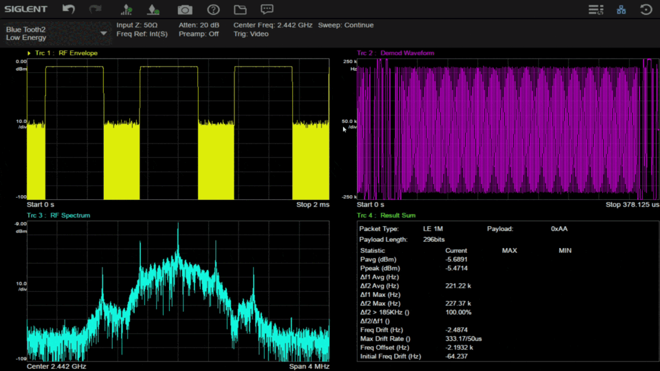SDG8000A還可一鍵生成藍牙、WIFI、LTE等常見無線通信信號波形,簡化復雜調(diào)制信號的創(chuàng)建流程。此外,SDG8000A還支持高速串行碼型信號輸出,如1.25 Gbps PRBS碼型,可滿足高速串行總線測試的需求。