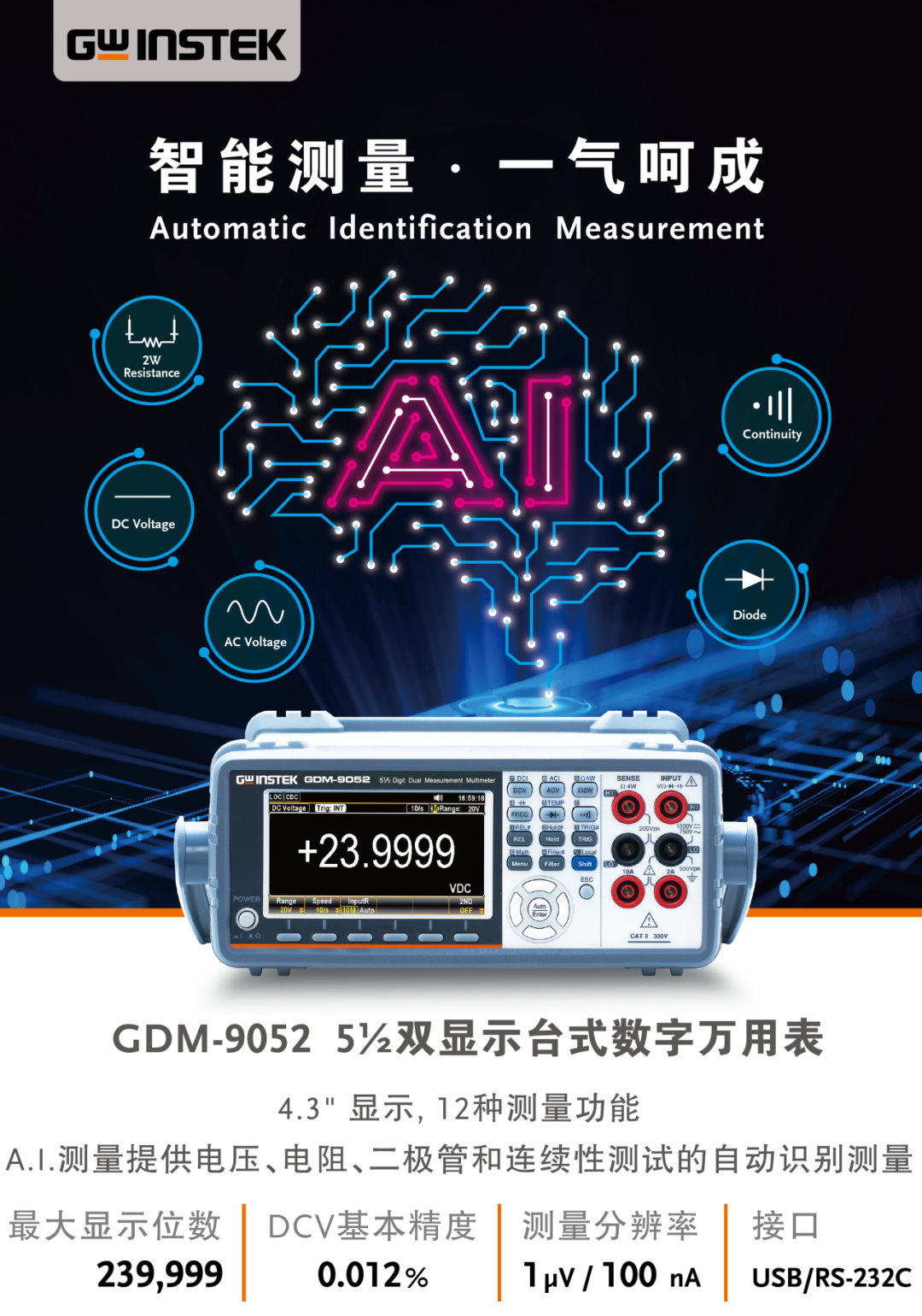 固緯電子推出新型5?雙顯示臺式數(shù)字萬用表GDM-9052,用于替代同類產(chǎn)品GDM-8351和GDM-8352。GDM-9052配備LCD顯示屏,支持最高239,999計數(shù),提供0.012%基本直流電壓精度,搭載A.I.智能測量功能,并配置USB/RS-232C接口,可為用戶帶來高精度測量體驗、清晰的數(shù)值觀測以及與個人計算機的便捷連接。