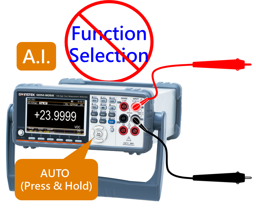 GDM-9052 是首款搭載自動識別(A.I.)測量功能的臺式電表。啟動該功能后,電表可自動識別輸入信號類型,并自動切換到相應(yīng)功能(包括AC/DC電壓、二極管測試、電阻測量及通斷測試),用戶無需手動切換測量模式。GDM-9052 將自動切換測量功能并進行測量,讓用戶更順暢地完成檢測任務(wù)并節(jié)省操作時間。