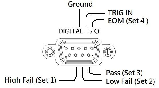 GDM-9052的數(shù)字I/O接口提供了通用與自定義兩種工作模式。在通用模式下,數(shù)字I/O將根據(jù)數(shù)據(jù)比較功能的結(jié)果自動輸出Hi Fail、Lo Fail、Pass及EOM(測量結(jié)束),同時支持外部觸發(fā)輸入功能。而在自定義模式下,用戶可定義四個引腳(SET1~SET4)的輸出條件,實現(xiàn)精準(zhǔn)的外部設(shè)備控制。