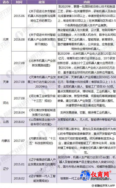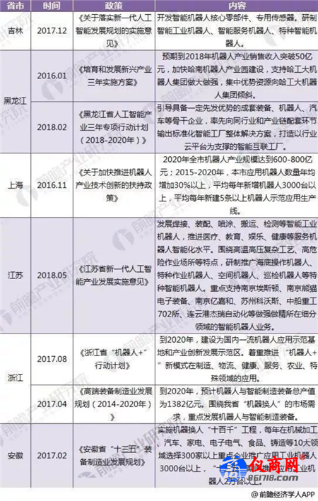 國家政策先行,地方政策迅速跟進:2016年以來,我國各省市圍繞“機器人”發(fā)布了多項產(chǎn)業(yè)促進政策,尤其是北京、天津、遼寧、上海、浙江等10個省市出臺了機器人相關的產(chǎn)業(yè)規(guī)劃。