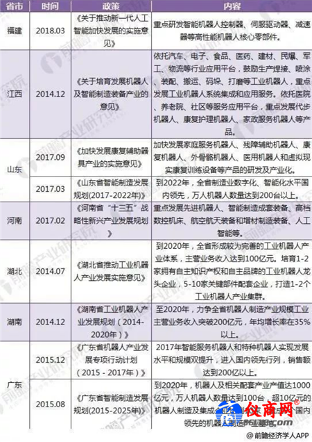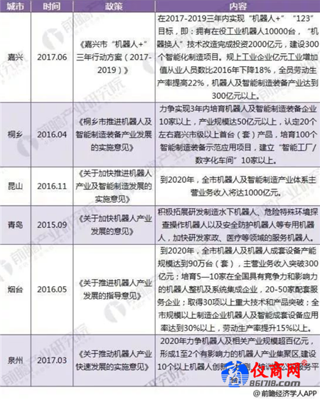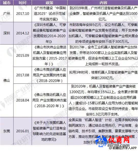 截至2018年,有14個地級市出臺機器人產(chǎn)業(yè)發(fā)展和加大科研投入建立智能型機器人研發(fā)機構(gòu)的相關政策和獎勵機制,包括廣州、佛山、東莞、嘉興、泉州、長沙等。