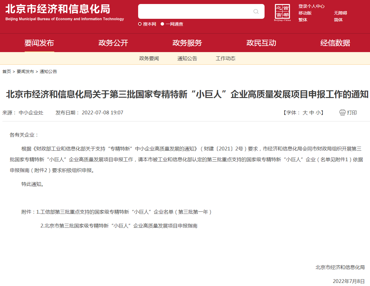 根據(jù)《財政部工業(yè)和信息化部關于支持“專精特新”中小企業(yè)高質(zhì)量發(fā)展的通知》(財建〔2021〕2號)要求,市經(jīng)濟和信息化局會同市財政局編制了《北京市第三批國家專精特新“小巨人”企業(yè)高質(zhì)量發(fā)展項目申報指南》,具體內(nèi)容如下。