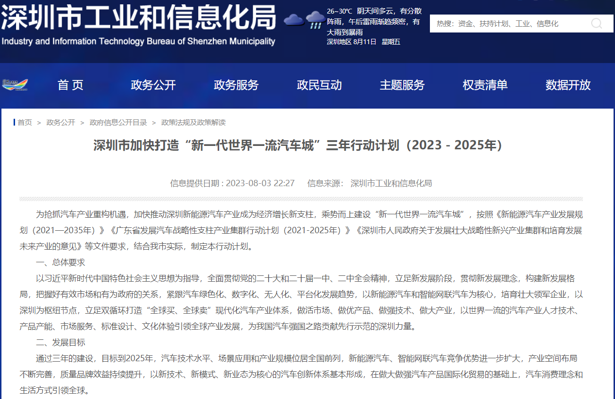 近日,深圳工業(yè)和信息化局發(fā)布《深圳市加快打造“新一代世界一流汽車城”三年行動計劃(2023-2025年)》(下文簡稱:《計劃》),計劃到2025年,汽車技術(shù)水平、場景應(yīng)用和產(chǎn)業(yè)規(guī)模位居全國前列,新能源汽車、智能網(wǎng)聯(lián)汽車競爭優(yōu)勢進(jìn)一步擴(kuò)大,產(chǎn)業(yè)空間布局不斷完善,質(zhì)量品牌效益持續(xù)提升,以新技術(shù)、新模式、新業(yè)態(tài)為核心的汽車創(chuàng)新體系基本形成,在做大做強(qiáng)汽車產(chǎn)品國際化貿(mào)易的基礎(chǔ)上,汽車消費(fèi)理念和生活方式引領(lǐng)全球。