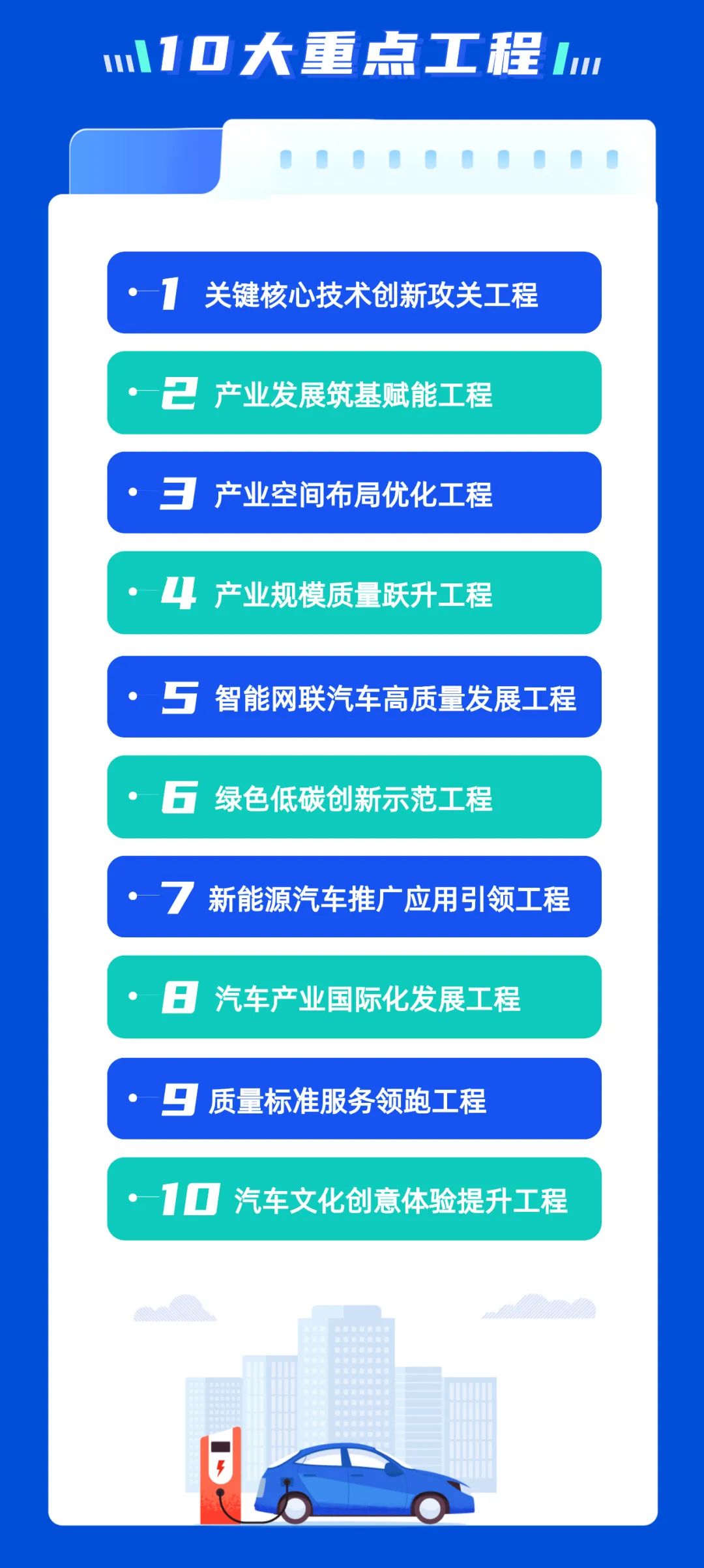《計劃》從技術(shù)創(chuàng)新、產(chǎn)業(yè)規(guī)模、空間布局、推廣應(yīng)用和生態(tài)培育等維度提出關(guān)鍵核心技術(shù)創(chuàng)新攻關(guān)、產(chǎn)業(yè)發(fā)展筑基賦能、產(chǎn)業(yè)空間布局優(yōu)化、產(chǎn)業(yè)規(guī)模質(zhì)量躍升、智能網(wǎng)聯(lián)汽車高質(zhì)量發(fā)展、綠色低碳創(chuàng)新示范、新能源汽車推廣應(yīng)用引領(lǐng)、汽車產(chǎn)業(yè)國際化發(fā)展、汽車質(zhì)量標(biāo)準(zhǔn)服務(wù)領(lǐng)跑、汽車生態(tài)文化體驗(yàn)提升等10項(xiàng)重點(diǎn)工程,并細(xì)分為30項(xiàng)具體任務(wù)。