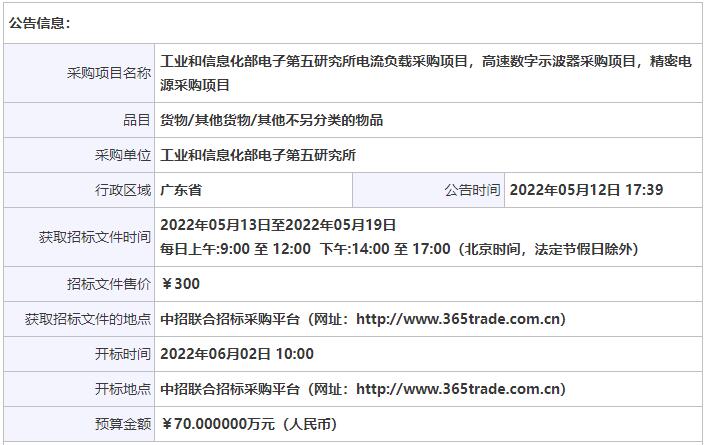 此次工業(yè)和信息化部電子第五研究所采購(gòu)高速數(shù)字示波器、電流負(fù)載以及精密電源各一臺(tái),預(yù)算分別為30萬(wàn)、15萬(wàn)、25萬(wàn)元人民幣。