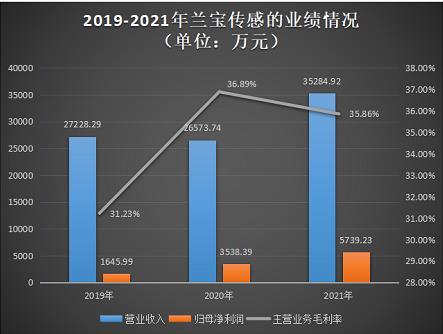 2019年-2021年蘭寶傳感具體的營業(yè)收入、歸母凈利潤、毛利率數(shù)據(jù)如下圖所示: