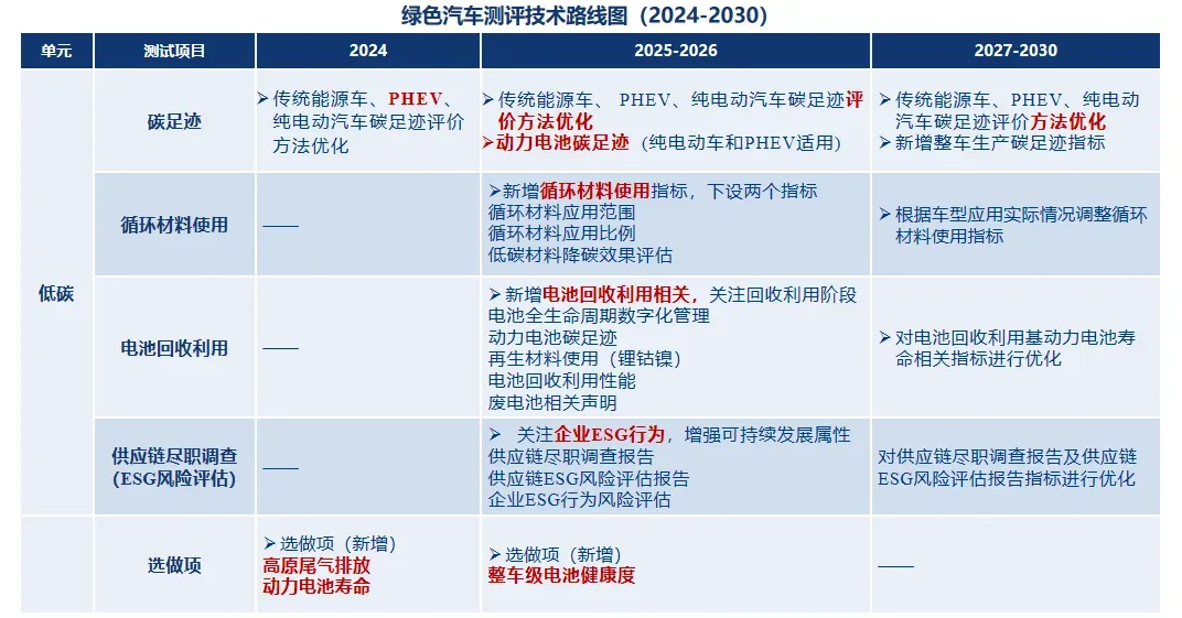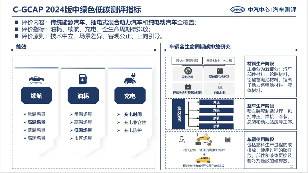 在測評(píng)領(lǐng)域,早在2012年中汽中心就籌備研究C-ECAP(中國生態(tài)汽車評(píng)價(jià)規(guī)程),以超前的視野和格局,從全生命周期維度搭建汽車節(jié)能環(huán)保性能評(píng)價(jià)體系,并從2015年開展測試評(píng)價(jià),開創(chuàng)了國內(nèi)汽車含“綠”量測試評(píng)價(jià)的先河。從最初的C-ECAP、EV-TEST(電動(dòng)汽車測評(píng))、CCRT(中國汽車消費(fèi)者研究與評(píng)價(jià)規(guī)程)到如今的C-GCAP(中國綠色汽車評(píng)價(jià)規(guī)程)2024新版規(guī)程的發(fā)布,中汽測評(píng)順應(yīng)行業(yè)發(fā)展趨勢推陳出新,圍繞車輛的健康、能效和低碳性能打造了逐步完善的綠色測評(píng)體系,助力汽車產(chǎn)業(yè)綠色低碳高質(zhì)量發(fā)展。