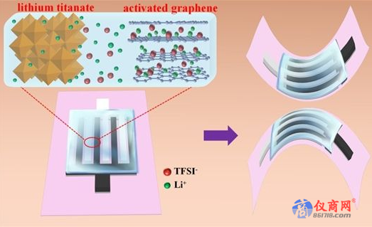 最近,研究團(tuán)隊(duì)在國際上率先開發(fā)出一種新概念、無需金屬集流體和傳統(tǒng)隔膜的高性能全固態(tài)柔性平面鋰離子微型電容器。該微型電容器以高導(dǎo)電石墨烯為集流體,以高電壓離子凝膠作為電解質(zhì),以納米鈦酸鋰為負(fù)極和活化石墨烯為正極構(gòu)筑出高離子電子傳導(dǎo)的平面交叉指型微電極,進(jìn)而在一個(gè)基底上組裝出全固態(tài)鋰離子微型電容器。該鋰離子微型電容器具有高能量密度53.5 mWh cm-3,高于目前報(bào)道的鋰薄膜電池和微型超級(jí)電容器。同時(shí),該鋰離子微型電容器具有優(yōu)異的循環(huán)穩(wěn)定性,6000次循環(huán)后電容保持率為98.9%;高溫電化學(xué)穩(wěn)定性,能在80 oC條件下穩(wěn)定工作;以及優(yōu)異的機(jī)械柔性,在各種彎曲和扭曲狀態(tài)下性能基本沒有衰減。此外,該鋰離子微型電容器表現(xiàn)出良好的模塊化集成能力,無需金屬連接體,可有效調(diào)控輸出的工作電壓和容量。