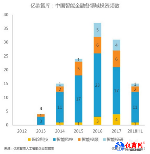 在智能金融領(lǐng)域,人工智能主要應(yīng)用于四大領(lǐng)域:保險(xiǎn)科技、智能風(fēng)控、智能投顧和智能投研。其中,智能風(fēng)控領(lǐng)域共獲投62次,占智能金融全領(lǐng)域投資的65.1%,是智能金融領(lǐng)域最受資本追捧的應(yīng)用領(lǐng)域。