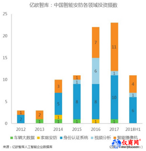 在智能安防領(lǐng)域,人工智能主要應(yīng)用于五大領(lǐng)域:身份認(rèn)證系統(tǒng)、智能攝像機(jī)、車輛大數(shù)據(jù)、視頻分析和家庭安防。其中,身份認(rèn)證系統(tǒng)共獲投39次,占智能安防全領(lǐng)域投資的47%,是智能安防領(lǐng)域最受資本追捧的應(yīng)用領(lǐng)域。此外,智能攝像機(jī)、視頻分析也是智能安防領(lǐng)域的投資大熱門。