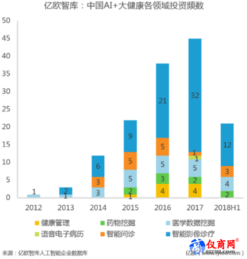 在AI+大健康領(lǐng)域,人工智能主要應(yīng)用于六大領(lǐng)域:智能影像診療、醫(yī)學(xué)數(shù)據(jù)挖掘、智能問診、語(yǔ)音電子病歷、健康管理、藥物挖掘。其中,智能影像診療共獲投82次,占AI+大健康全領(lǐng)域投資的57.7%,是AI+大健康領(lǐng)域最受資本追捧的應(yīng)用領(lǐng)域。